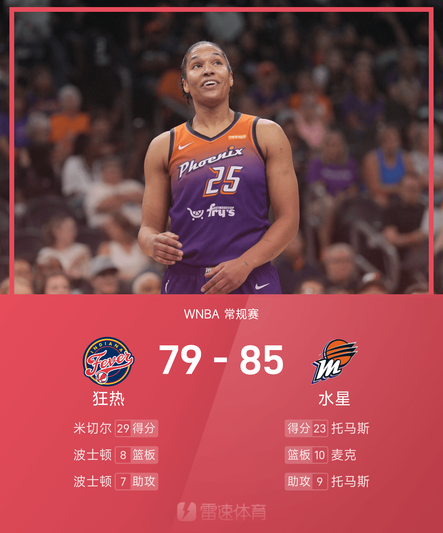 09月03日讯 25赛季WNBA常规赛,水星对阵狂热。双方全场战罢,水星85-79战胜狂热。托马斯得到22分9板9助率队取胜,米切尔空砍全场最高的25分4板4助。